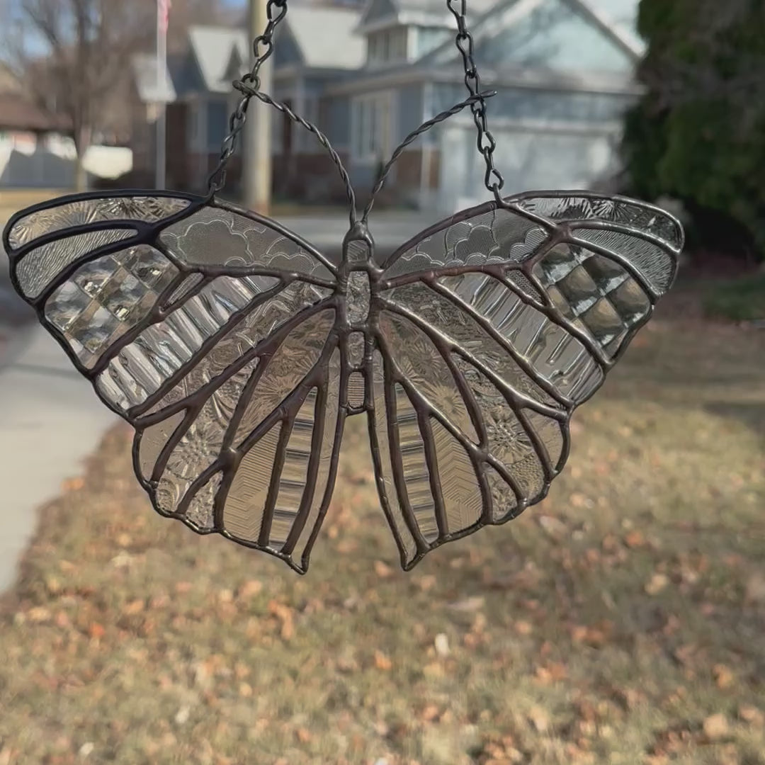 This handmade stained glass butterfly uses only clear varieties of glass. Most types of clear glass aren’t made anymore, so it was quite a challenge to find this many.